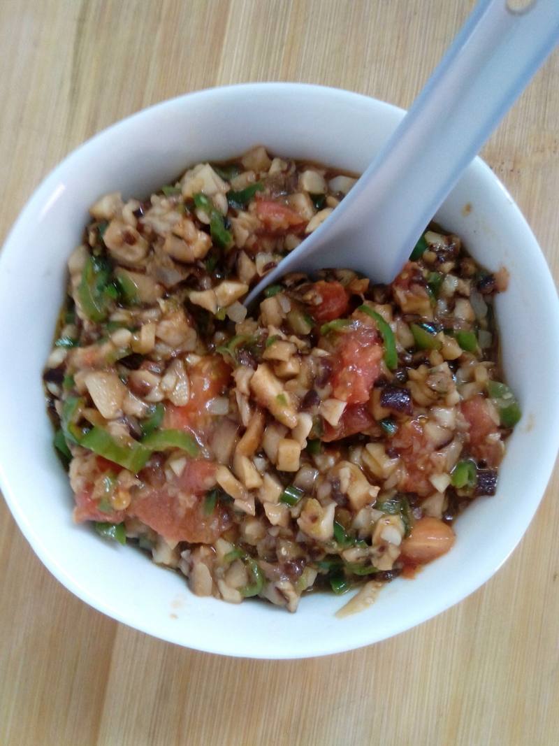 1:剁椒提前一天晚上漂在冷水里面,因为剁椒太咸了!大葱剁成末,剁椒控水,锅里面多倒油,油温升一半热时,放入葱末,豆瓣酱,番茄酱炒出香味时,到入剁椒炒,炒出辣味时,加入少量的盐(因为剁椒和豆瓣酱都是咸滴),加入十三香,味精,鸡精炒,炒一会儿加半碗点清水熬一会儿,出锅时加半勺白糖,再放入淀粉水勾芡出锅行啦!炒滴时候忘拍照啦,只有成品啦!