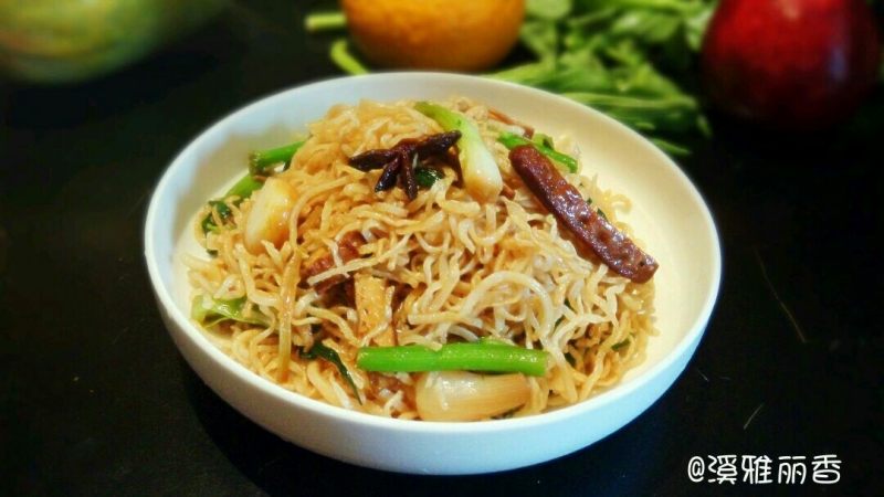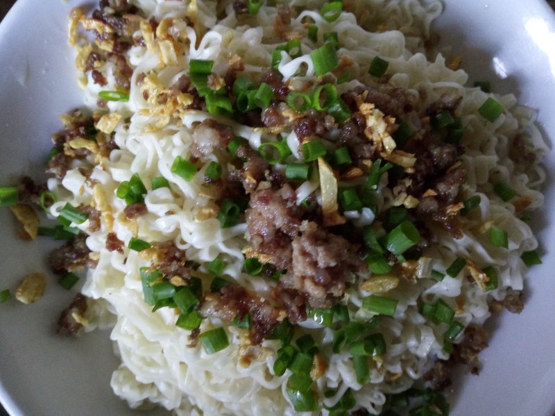 4:将炸香的肉和蒜末带少些油浇到面上,再将葱花撒上,顺便加点酱油。(本人惯用味事达,比较提味。)