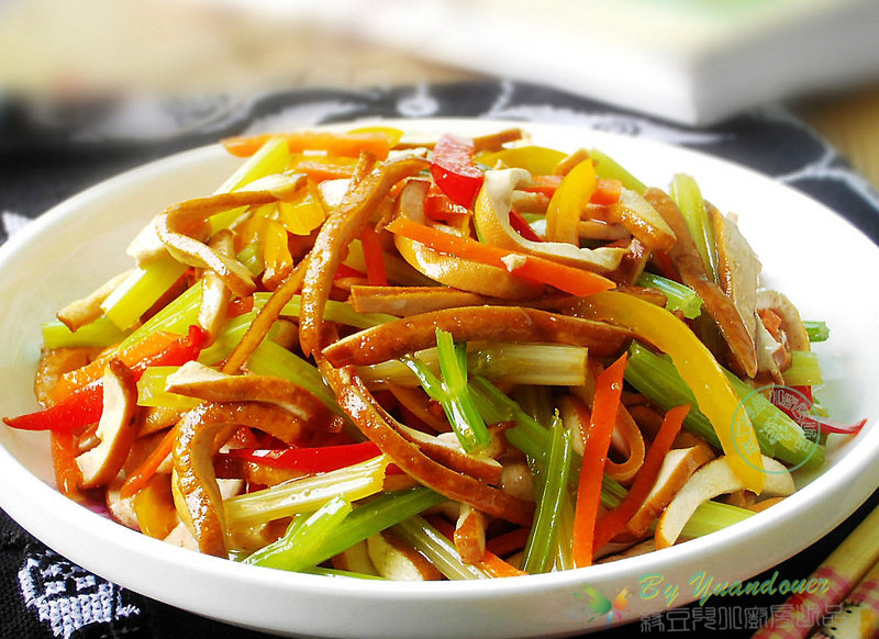 香干4片;芹菜3棵;胡萝卜1/3根;红菜椒1片;黄菜椒1片;