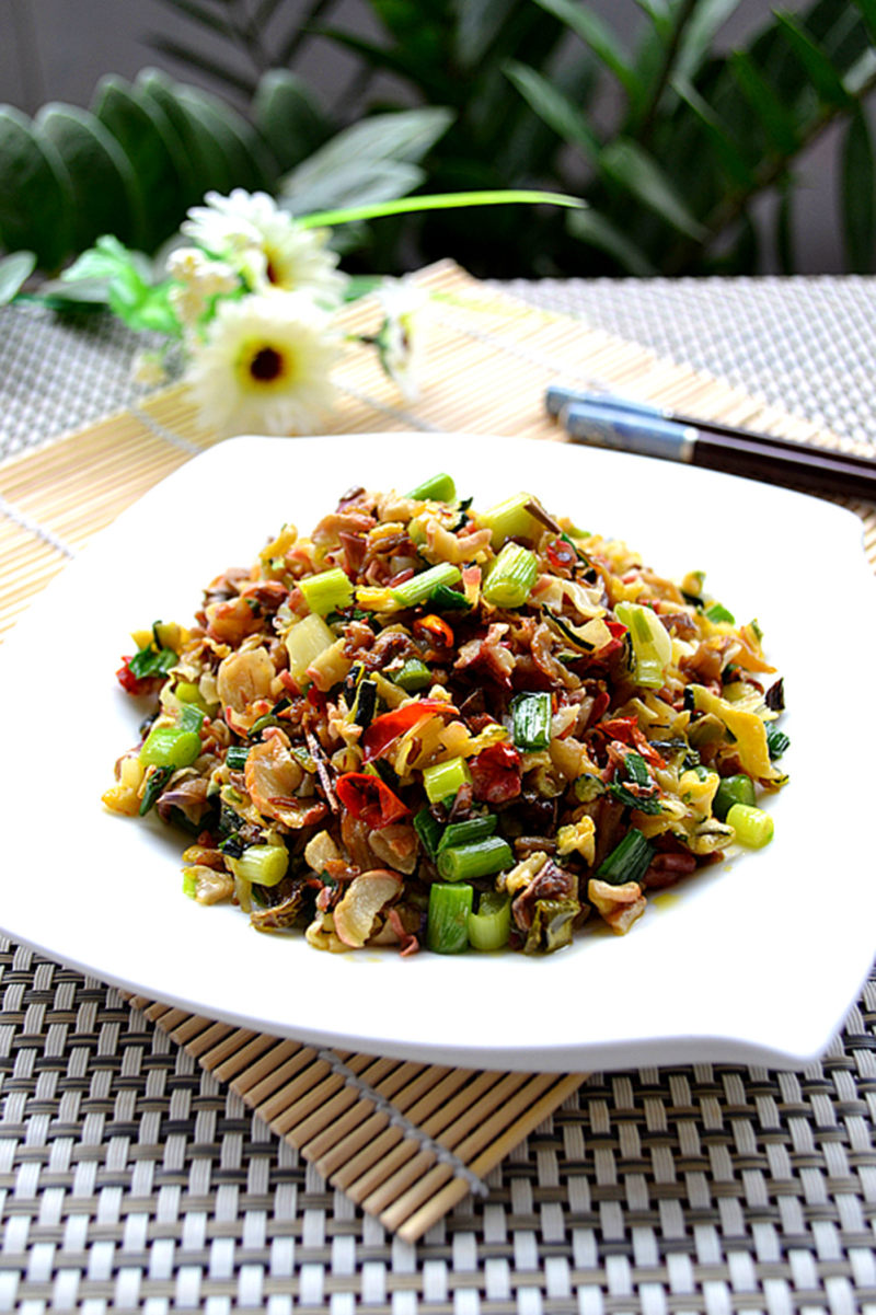 菜干尽量切小些,这样好入味;泡好的菜干用手用力攥干水份,如果菜干含水份太大的话,炒出来不够香脆