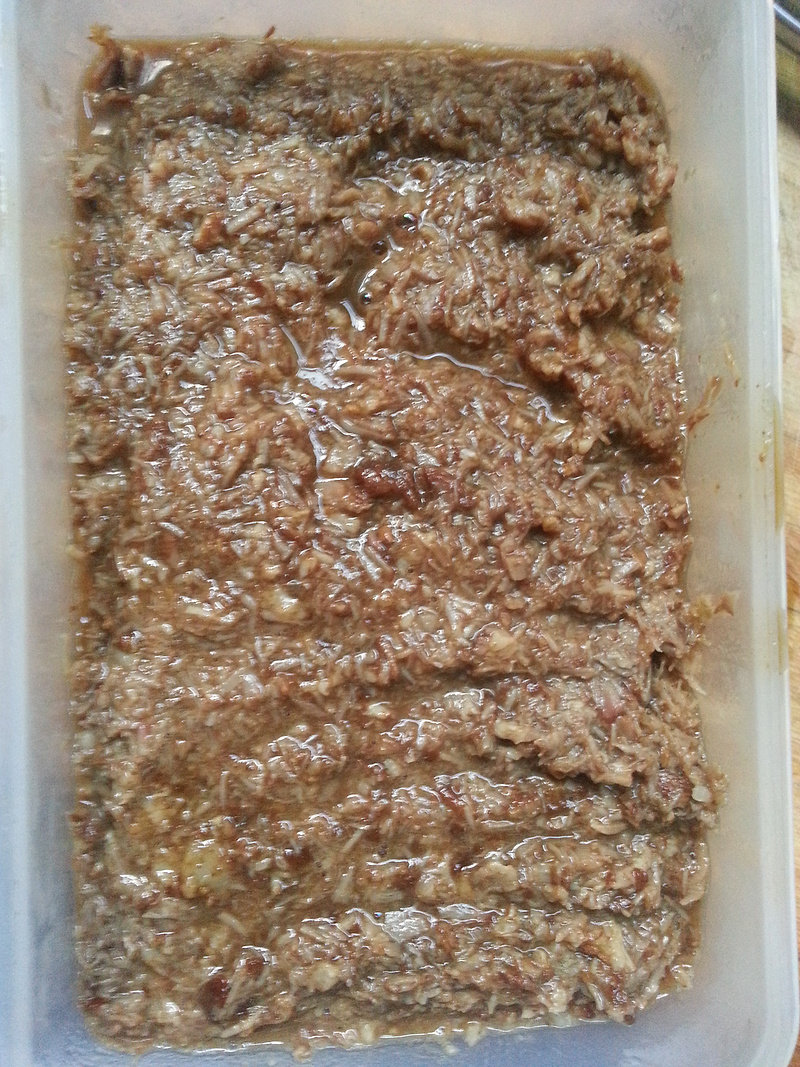 4:我用的这种手摇的打馅器,省得费劲去用刀剁了。看,肉丝出来了吧(话说,能打成沫的料理机使不得,咱费劲弄肉丝是干啥的来着)