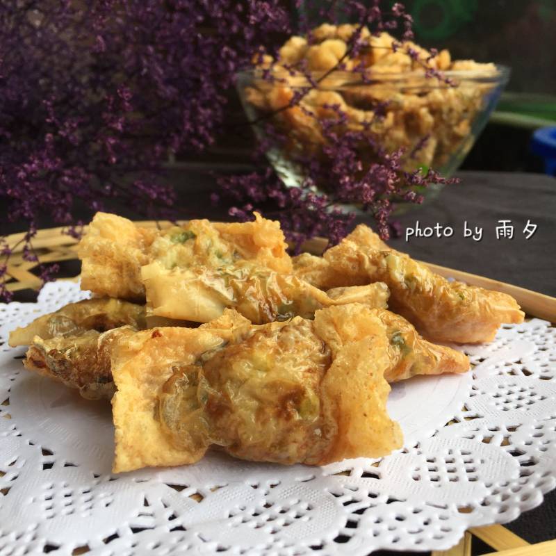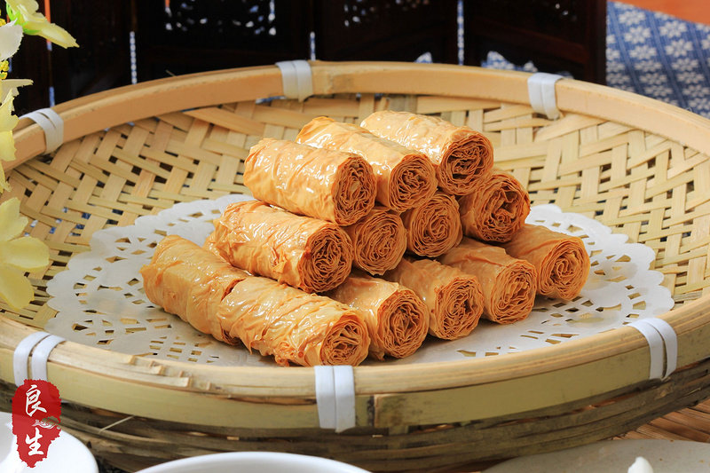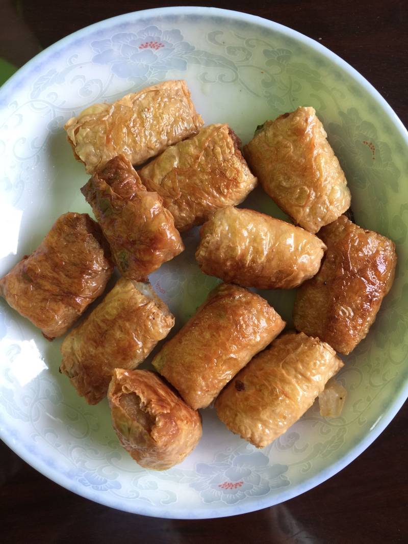 雨夕碎碎念:豆皮,如果买到比较厚的话,可事先泡下软,这样好操作些;我这豆腐皮是农家散买的,放冷冻常年随吃随取,所以这次做的时候就比较麻烦,都是散的,本来一整张的话,馅料放好,一卷就一条,一切就好多了;还有就是我比较喜欢薄点的,如果亲们喜欢更酥脆可以豆腐皮卷多几层;