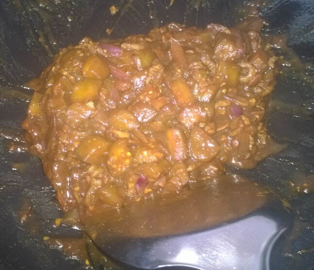 3:加茄丁、酱,稍炒几下加水即可,不加水会糊。炒至收干即可