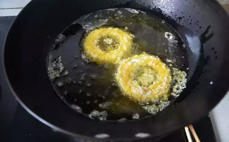 5:锅中加油烧热下入苹果圈炸至两面金黄即可
