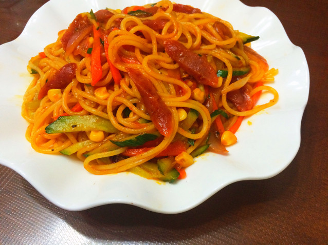 7:意面和黄瓜下锅炒匀,调入适量盐,黑胡椒粉