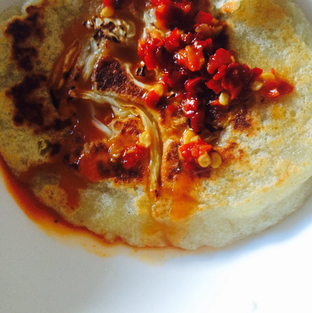 2:锅中放油,烧热用勺把糊倒锅里,摊成圆型,(我的不怎么地哈)待一面定型,翻另一面