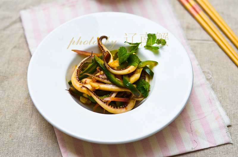 5:之后将鱿鱼头和菜丝过凉,鱿鱼头要进行分割。