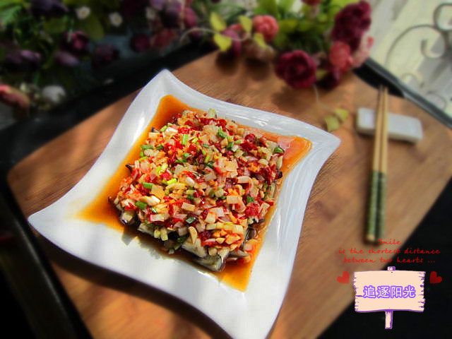 1:茄子去皮切厚片,蒸熟。如果您用的是长茄子,就不用去皮了。