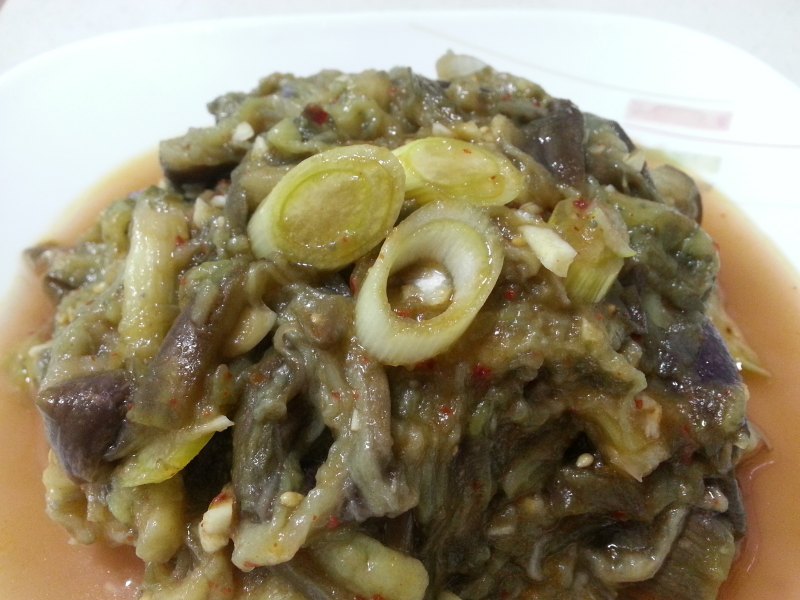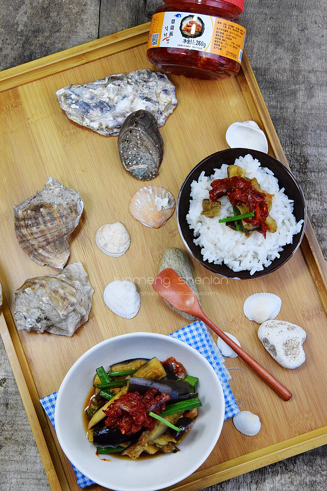 1:主料:茄子2根、章鱼酱100克配料:韭菜、大蒜适量调料:盐1小勺、鱼酿酱油2大勺、鱼露1小勺、香油2小勺