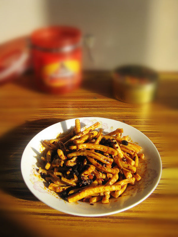 6:油热后把鱿鱼干倒下去炸,放点盐,炸到鱿鱼干表面变脆,把鱿鱼干捞起来放到砂锅里,油留下。