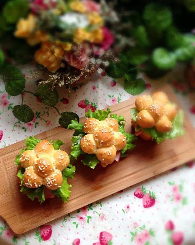 1、如果没有梅花模具,也可以把面包生胚整成花朵形状,放进小一点的圆形模具。2、因为这个模具我一共只有3个,所以分两次烤了6个汉堡包,其余面团做成其他花式面包了。