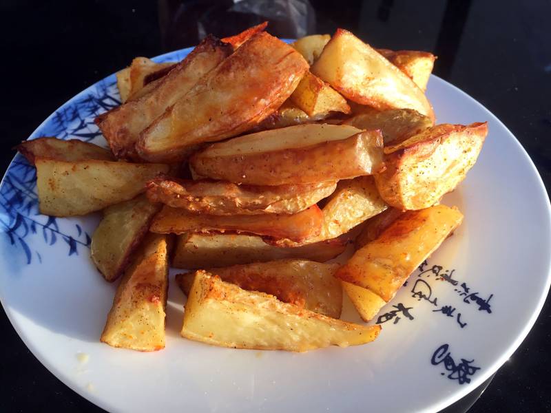 小提示:一、土豆条尽量平铺,要不累叠起来烤,排放土豆条时皮蛋量向下,这样就不太粘烤盘了;二、尽量用特制可以用来烤的玻璃盘,烤完后冷却,放水泡一会,就很容易清洗了;三、各家的烤箱是有区别的,有些比理论上的刻度高些,有些则低些,笔者给出的温度与时间不一定合适你的烤箱,自己烤箱使用多次后就能比较熟悉您烤箱的特点了,这里给出的时间和温度,目的两个,一是把土豆条烤熟,这个容易,不熟再烤过,二是将表面烤香和上色,不妨告诉您我的经验,表火是很容易把东西烤糊的,用底火时还有层烤盘托着食物,而用表火时发热管直接对着食物了,所以用表火时尽量不要长时间离开烤箱,快到一半时间时最好开箱灯观察了,一旦烤到上色足够,时间还没到时也可以随时把食物撤出烤箱。
