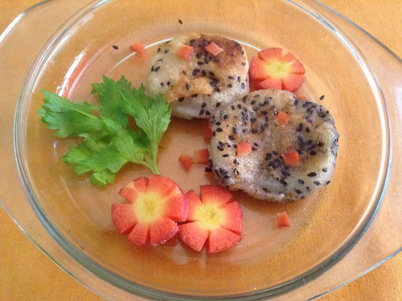 7:取一个盘子,倒入一些白芝麻,然后把小饼放入芝麻盘中,轻轻按压一下,使小饼沾满白芝麻。