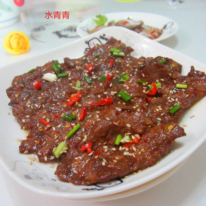 7:我是晚上烤的,晾到第二天早上,牛肉干外表很干,但心里还有些软,喜欢吃硬的就再烤一烤。或直接放盘内风干。