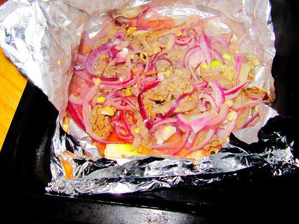 7:烤盘上刷上油,铺上牛肉条