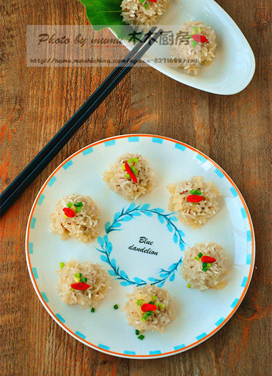 7:糯米淘洗干净,将肉丸在糯米粒滚一圈,粘上糯米