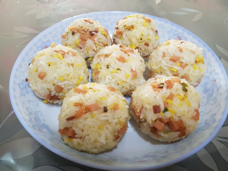 2:将蒸好的糯米、蛋沫、三明治,加入适量盐味精、一只生蛋,一起搅拌均匀,捏成大小合适的圆子,捏之前可以打一碗水把手沾湿,这样就不用担心糯米太沾手。捏好后上锅蒸,放的时候隔一些空隙,避免黏在一起。