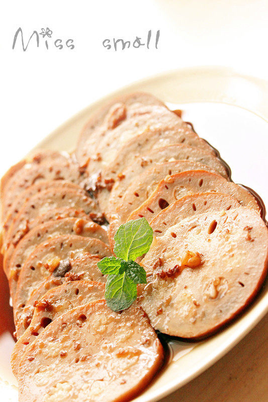 6:压力锅中加清水,放入冰糖、红糖、红枣煮15分钟,吃时切片淋上糖桂花、蜜汁即可。