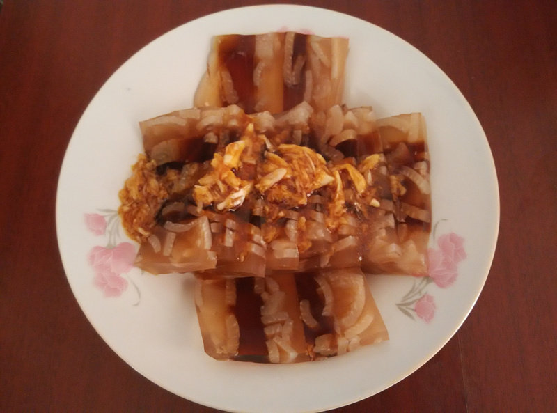 7:色拉油,酱油,辣椒酱,大蒜,葱,盐,糖调成酱汁,浇到切好的肉皮冻上,完成了。