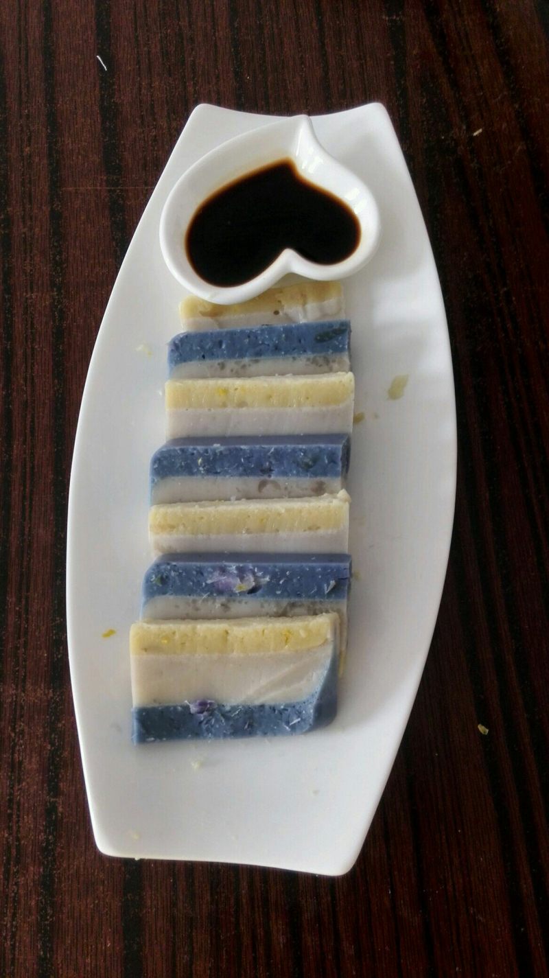13:整个凝固以后从模具中慢慢脱模取出,切成自己喜欢的造型摆盘,吃的时候,可以蘸醋、香油、油泼辣子