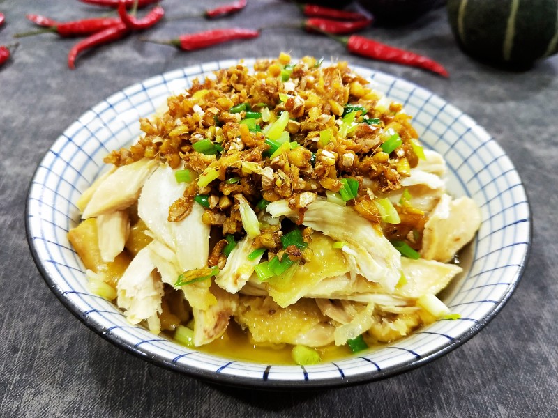 4:鸡切好摆盘,淋上葱油即可。