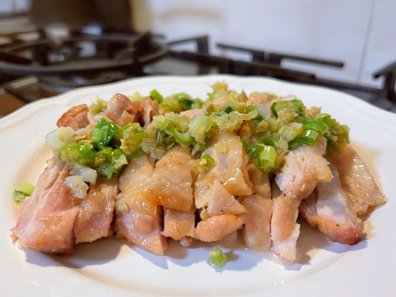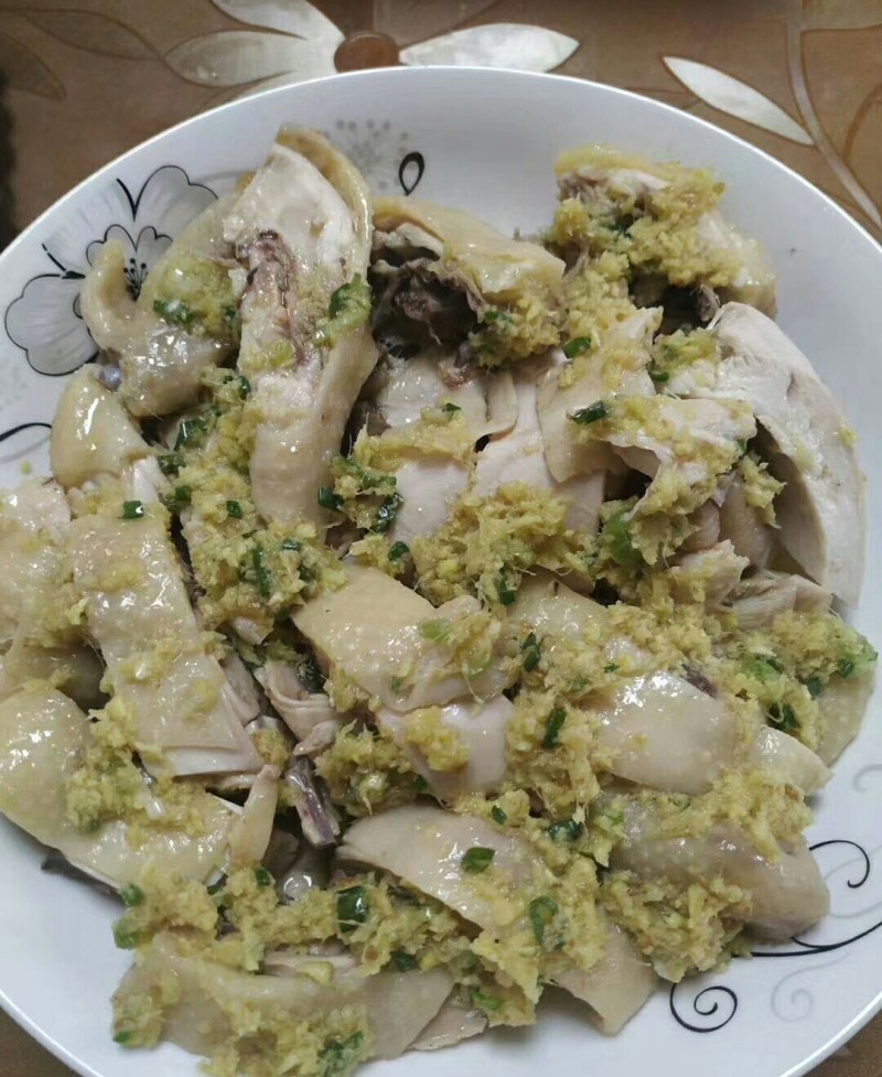 6:将姜葱酱浇入鸡肉表面,完成。