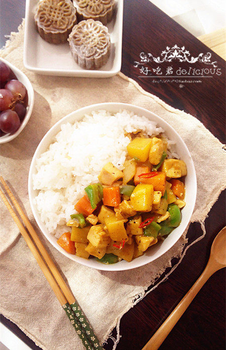 这道菜主要是因为我上顿做咖喱乌冬面的时候没吃完,还剩一些咖喱酱和上顿没用完的蔬菜,于是就产生了这道菜,正好配晚上炸的鱿鱼圈,又是一番滋味。。。