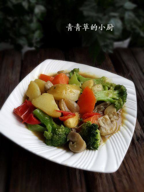 土豆1个;西兰花100克;胡萝卜半个;口蘑5朵;红辣椒半个;红葱头2个;蒜4瓣;
