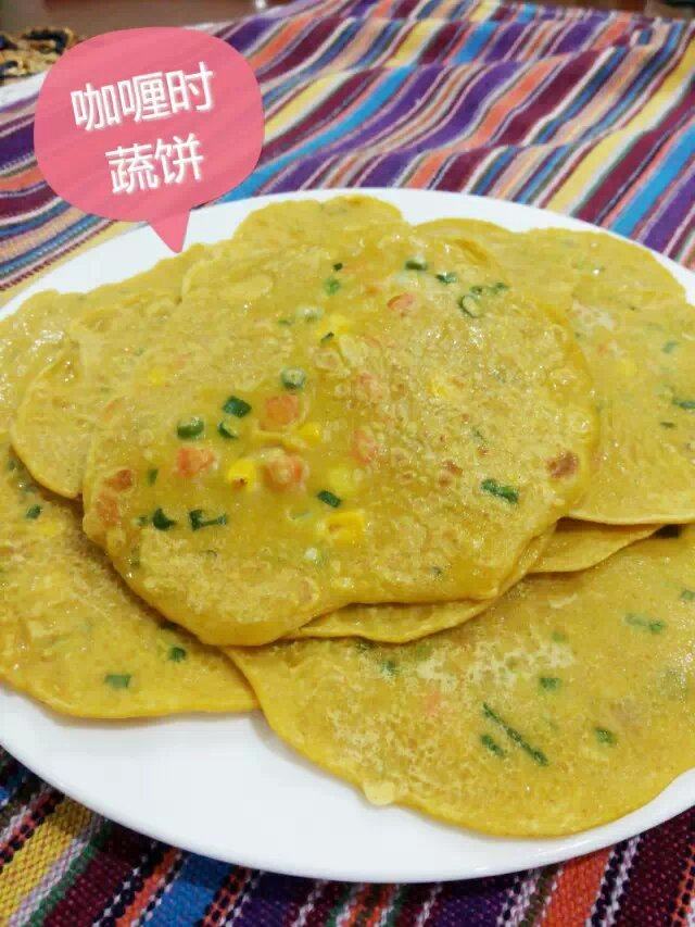 2:把各类蔬菜丁(胡萝卜丁,玉米丁,青豆丁)入锅中煮熟,我是在超市买现成的冷冻的蔬菜丁,如没有也可以自己根据自己的爱好放入当季的蔬菜,绿叶青菜也可以。把面粉放入盆中,倒入鸡蛋液,葱花,蔬菜丁,放入少许盐,加入一些咖喱粉,拌好成稀糊即可。