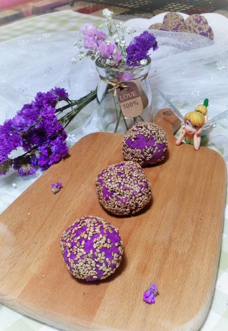 5:全部揉好后在紫薯球上滚一圈熟芝麻,再用手轻轻的把熟芝麻揉进表面
