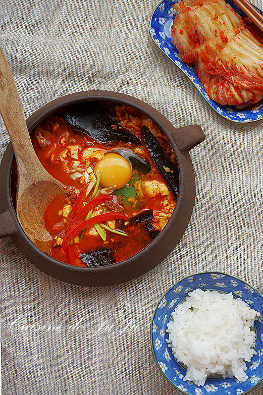 绞牛肉100g;绢豆腐200g;辣椒粉半勺-1勺;蒜末少许;鸡蛋1个;葱1根;韩国辣酱1勺;