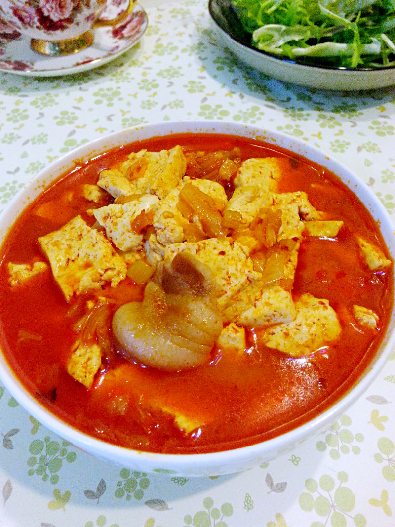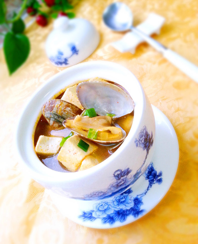 3:步骤三:豆腐平铺在辣白菜之上步骤四:西红柿切块平铺在豆腐之上步骤五:加少许料酒,干锅烧至葱姜蒜出香味为止(大致时间2-3分钟)步骤六:加入淘米水,没过食材多出三分之一即可。加入韩式辣酱一勺,韩国大酱一勺,食盐少许 白砂糖少许 大火煮沸 转文火煮至15分钟即可 出锅前5分钟加入蛤蜊!
