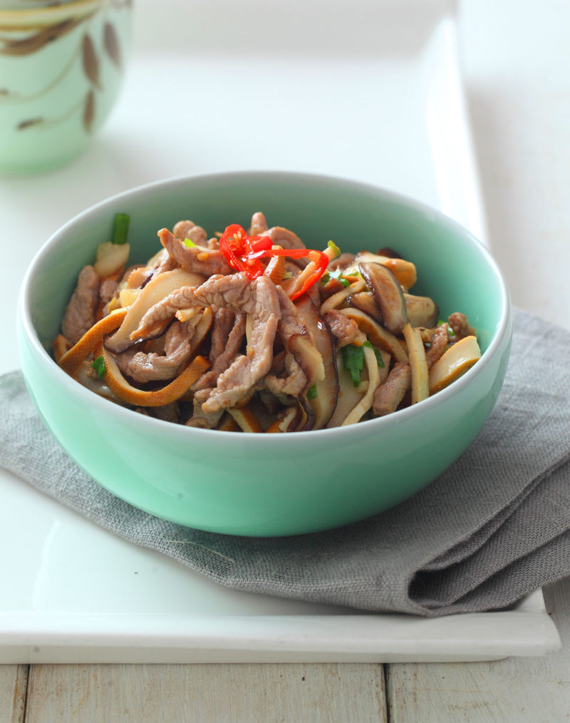 4:肉丝断生后倒入双菇继续煸炒,加盐再煸炒