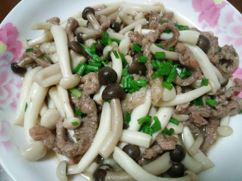 2:肉丝用黑胡椒,少许盐和生抽,还有淀粉腌制10分钟,双菇去根洗净,葱洗净,葱白切一寸左右其余切葱花。热锅倒油放入切好的葱段煸香