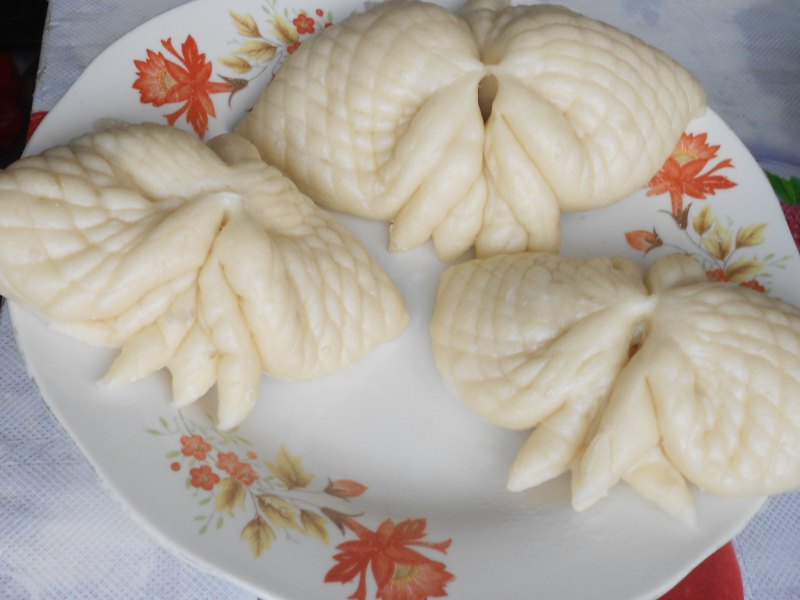 3:把肉馅放在白菜叶上向根部卷起。放在盘中。上锅蒸十分钟。