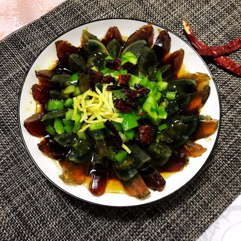 2:松花蛋切块。摆盘。在松花蛋上加入适量生抽,醋。把姜切丝,青椒切块,放在皮蛋上。