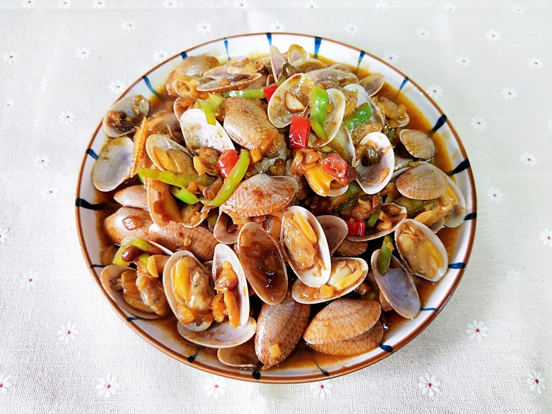 花蛤500g;生抽两茶勺;姜3片;色拉油适量;辣椒5克;