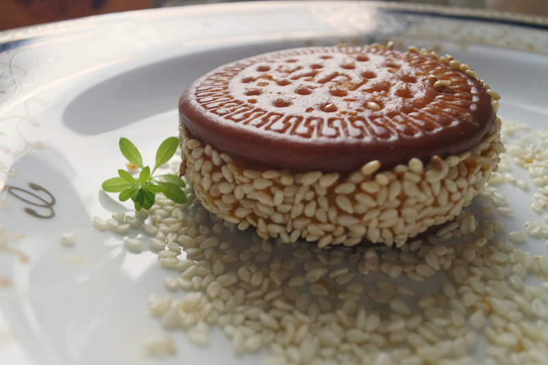 9:将做好的南瓜饼两面沾裹白芝麻。