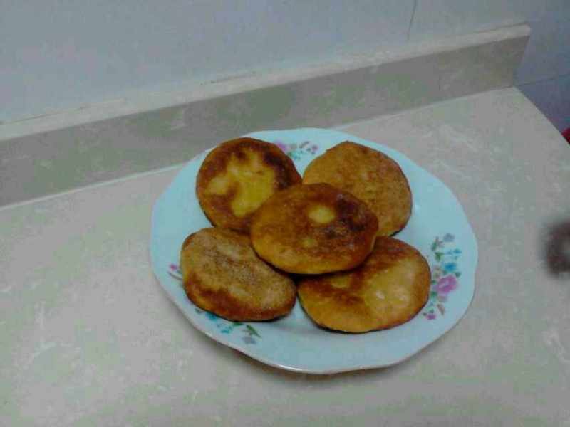 5:成品出炉!个人认为,南瓜饼中加豆沙馅或鲜肉馅的比较好吃,我在这里偷了个懒,不想出去买食材了。呵呵..