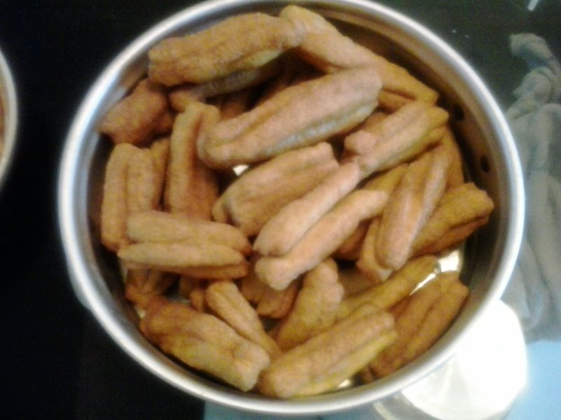 2:锅上热油,油温七成热时,拿起一个两手轻轻一拉,慢慢下如锅中,两面炸至金黄!