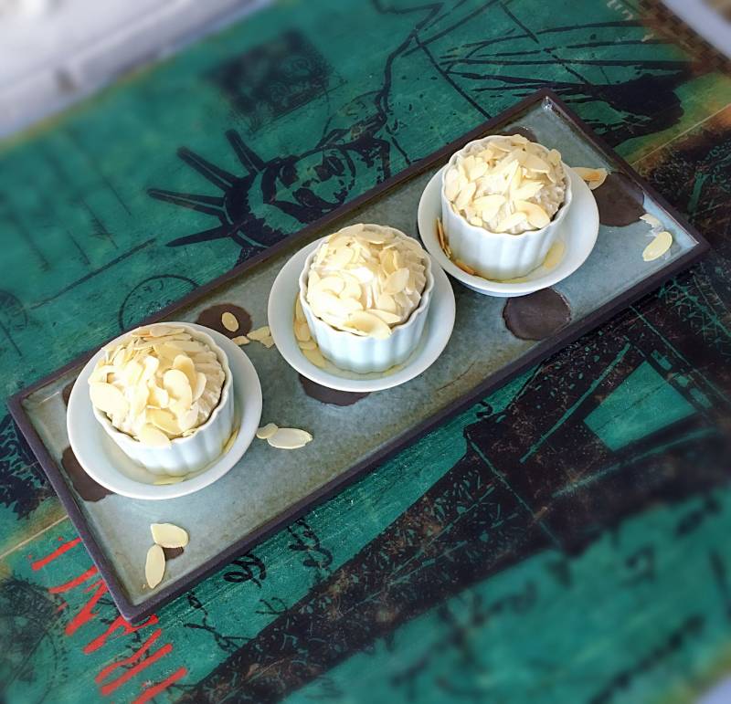 5:保鲜袋剪去一角,将山药泥挤入碗碟里,撒上杏仁片即可。
