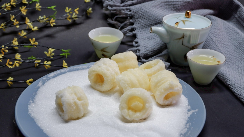 3:将长条绕三圈且两端相连,一个白糖糕雏形就出来了。