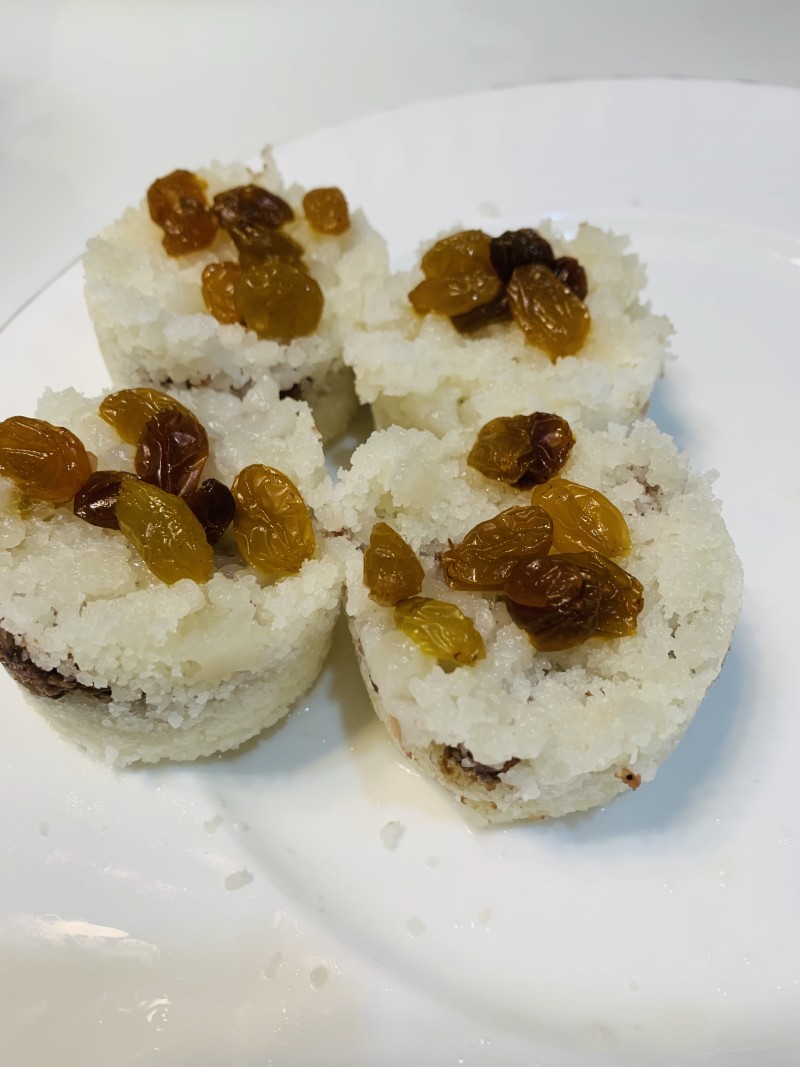 粘米粉,250克;酵母4克;糖4勺;葡萄干适量;
