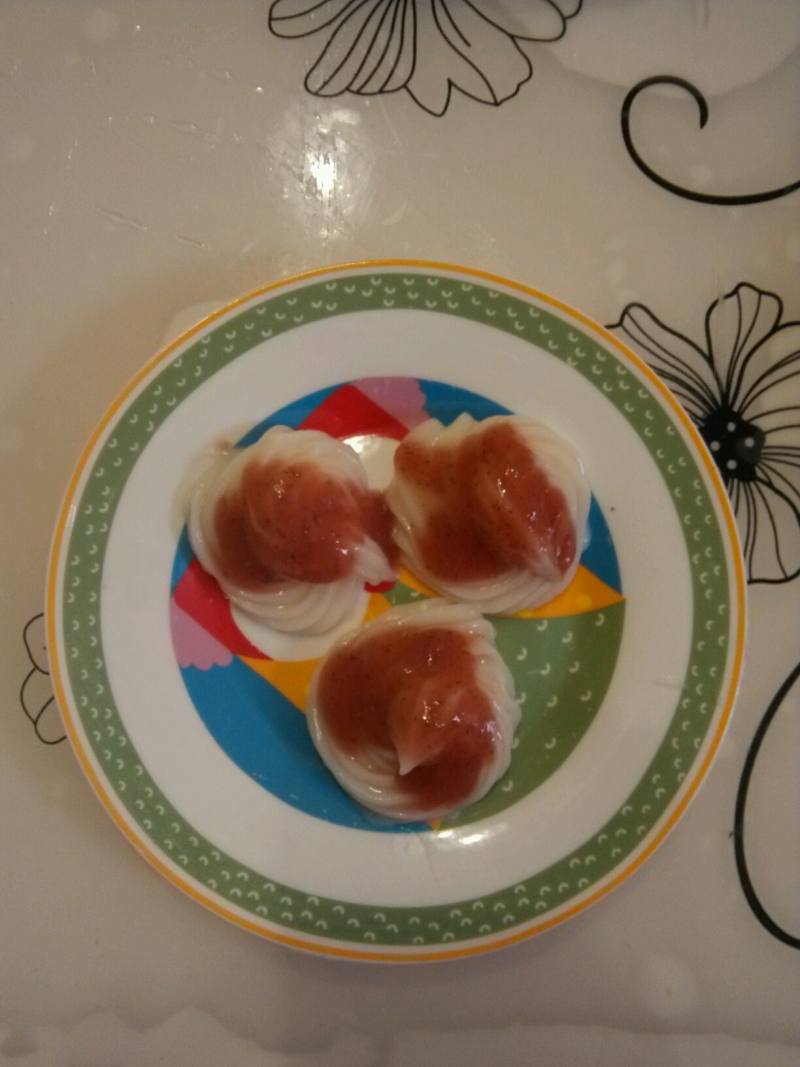 9:草莓酱用白开水稀释以后浇在山药泥上即可食用。