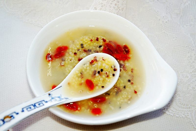 6:煮至合适的黏稠度,就是自己喜欢的黏稠度就可以关火了,关火之前加入洗干净的枸杞子,再煮一分钟即可关火。