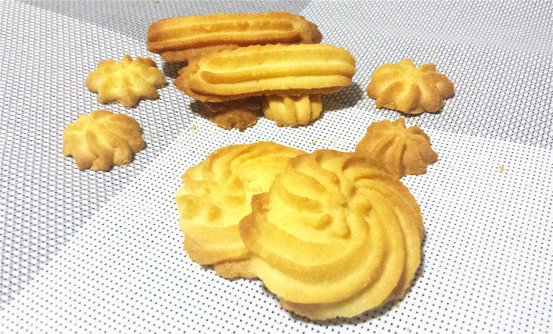 7:用大号花嘴在垫了油纸的烤盘上挤出均匀的曲奇花