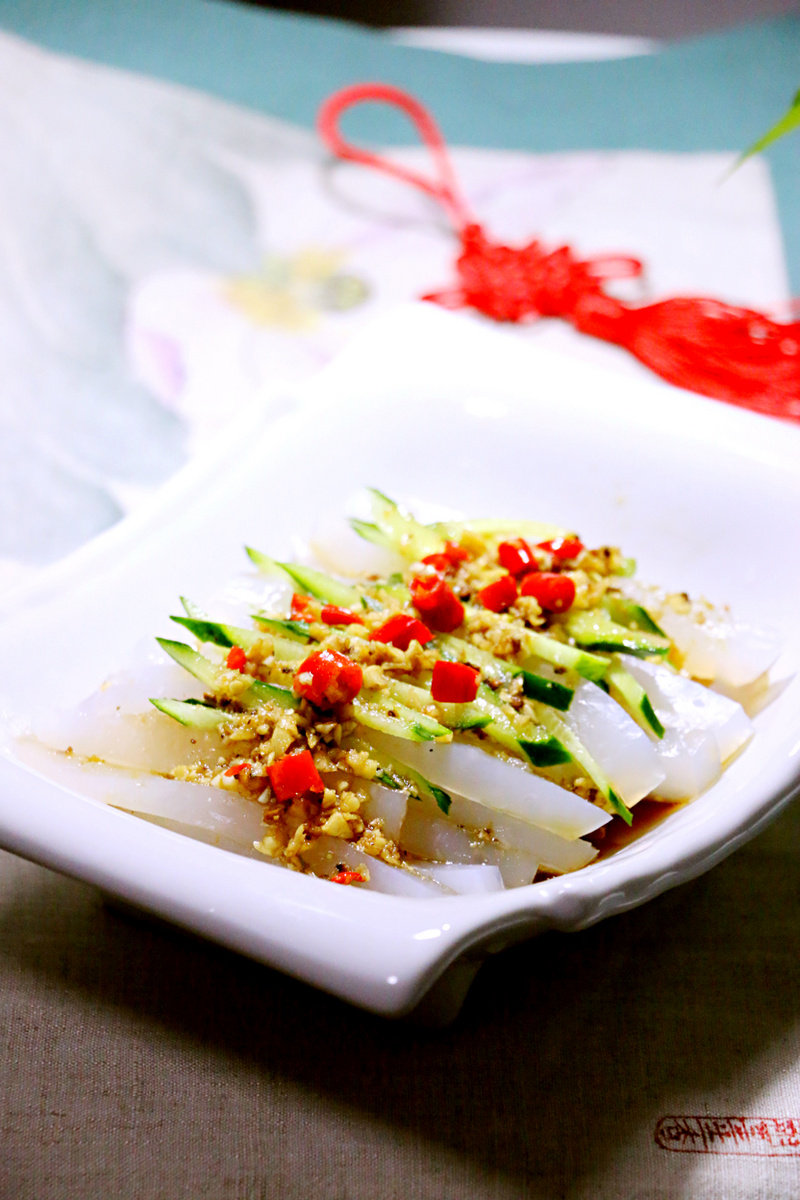 豌豆淀粉100克;水600克;黄瓜适量;大蒜适量;辣椒适量;