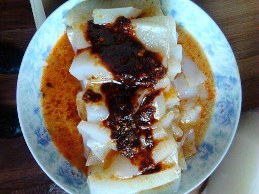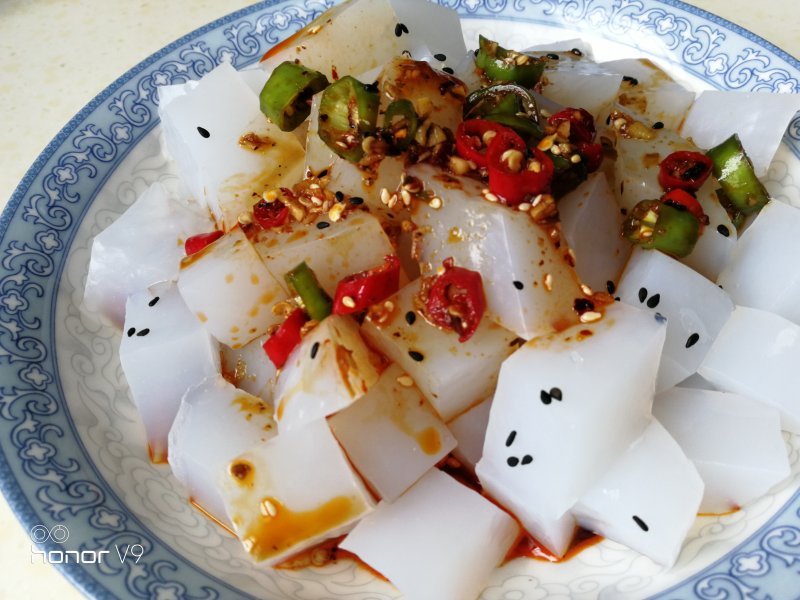 9:凉粉切片放入碟子中,上面撒上切好的胡萝卜丝(黄瓜丝亦可),淋上芥末汤汁和辣椒油(家乡有名的辣椒油),哇喔,可以开吃了。
