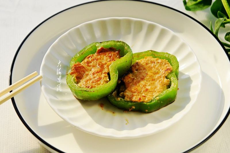 5:平底锅中加入适量的油,码入辣椒圈,用小勺将调好的鸡胸肉馅灌入青椒圈中,灌满压平,继续小火煎。注意控制温度,火不要过大,糊了就不好吃了。