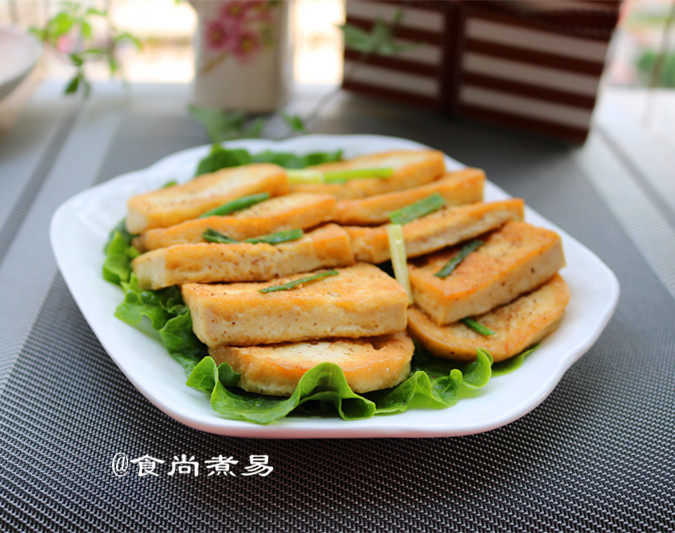 5:将煎好的豆腐摆盘,撒上椒盐,装饰一下就可以享受美味啦~